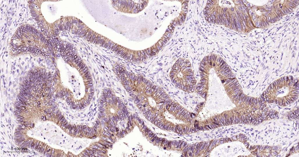 Immunohistochemical analysis of paraffin embedded Human colon cancer tissue slide using IHC0567H (Human delta Catenin Kit).