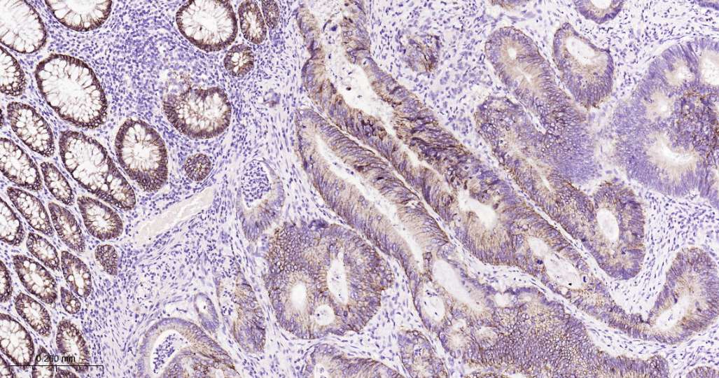 Immunohistochemical analysis of paraffin embedded Human colon cancer tissue slide using IHC0568 (CLDN1 Kit).