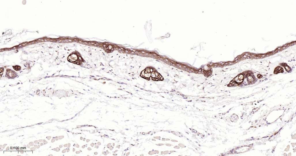 Immunohistochemical analysis of paraffin embedded Mouse skin tissue slide using IHC0568 (CLDN1 Kit).
