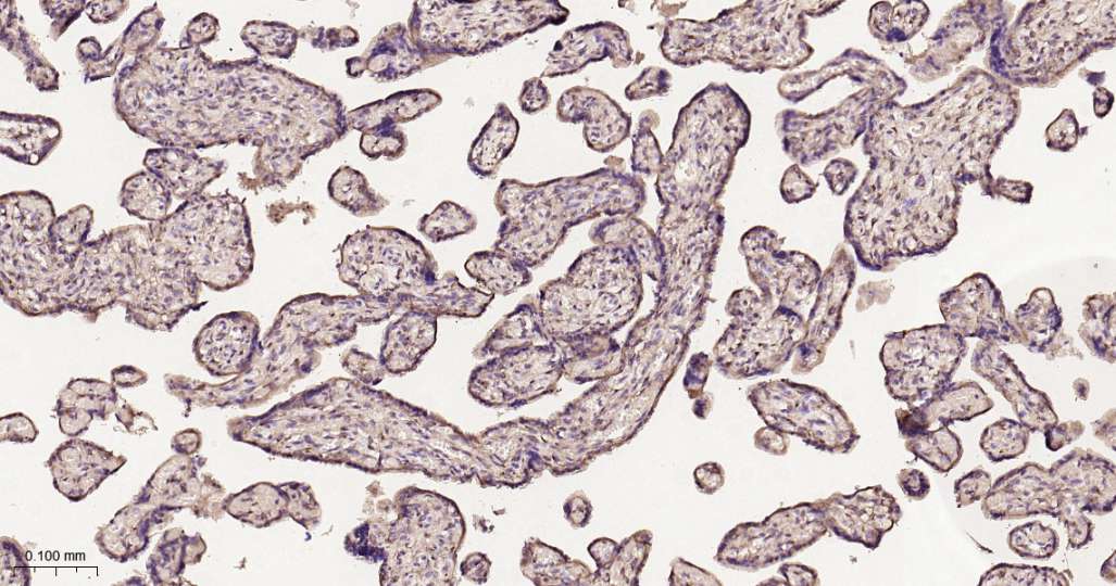 Immunohistochemical analysis of paraffin embedded Human placenta tissue slide using IHC0569H (Human LRP1 Kit).