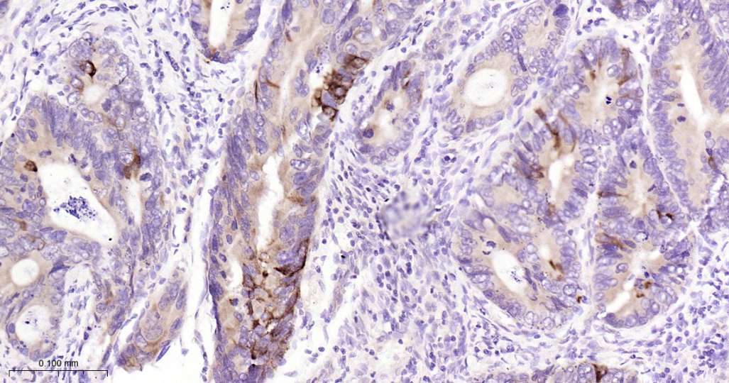 Immunohistochemical analysis of paraffin embedded Human colon cancer tissue slide using IHC0571H (Human Trefoil factor 1 Kit).