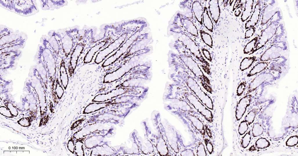 Immunohistochemical analysis of paraffin embedded Rat colon tissue slide using IHC0574R (Rat MCM2 Kit).