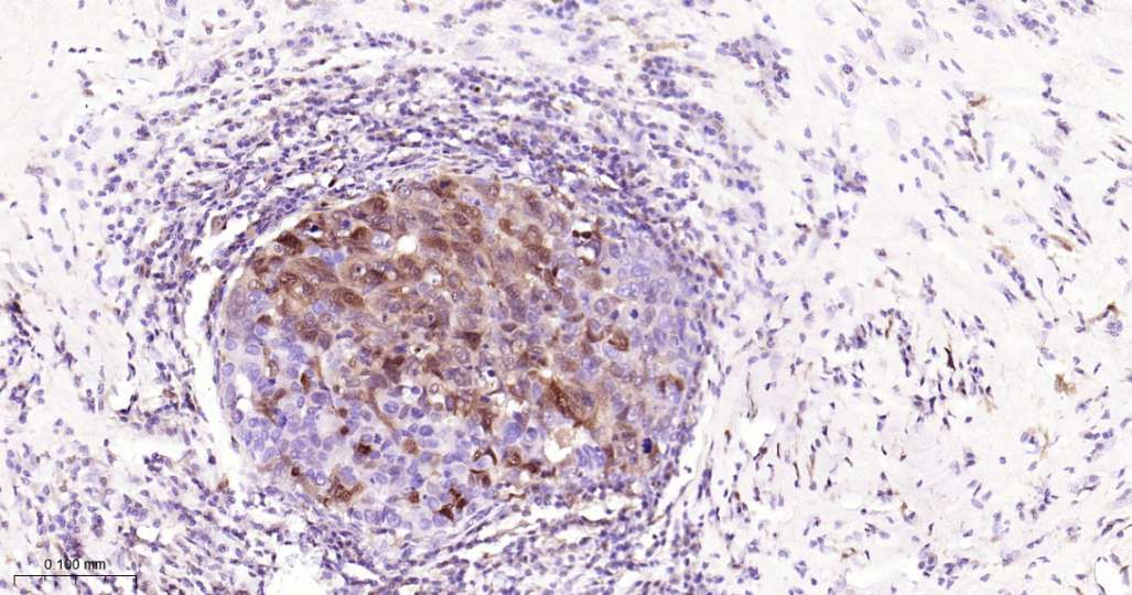Immunohistochemical analysis of paraffin embedded Human breast cancer tissue slide using IHC0579H (Human TMS1/ASC Kit).