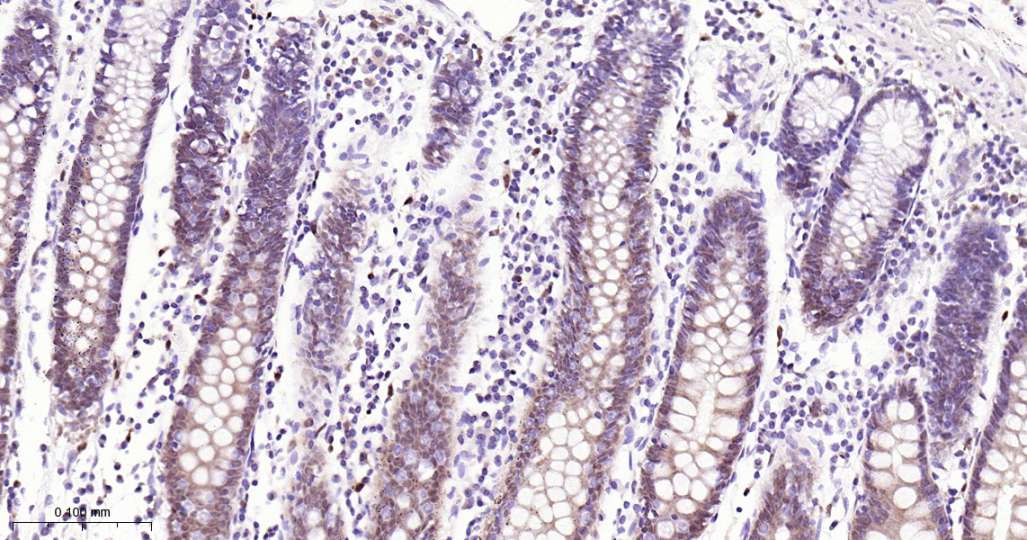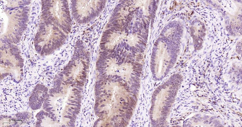 Immunohistochemical analysis of paraffin embedded Human colon cancer tissue slide using IHC0579H (Human TMS1/ASC Kit).
