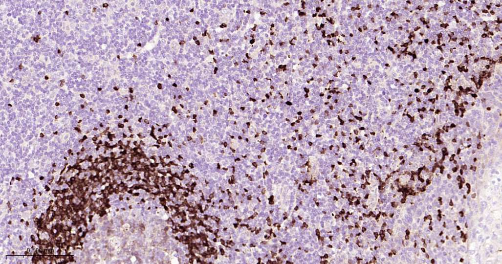 Immunohistochemical analysis of paraffin embedded Human lymph nodes tissue slide using IHC0584H (Human TCL1A Kit).