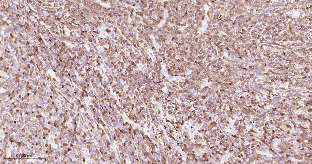 Immunohistochemical analysis of paraffin embedded Human spleen tissue slide using IHC0584H (Human TCL1A Kit).
