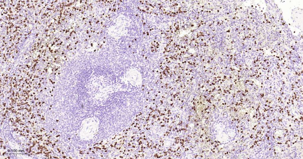 Immunohistochemical analysis of paraffin embedded Human spleen tissue slide using IHC0586H (Human CD15/SSEA1 Kit).