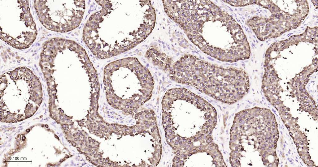 Immunohistochemical analysis of paraffin embedded Mouse testis tissue slide using IHC0591 (HSP90 beta Kit).