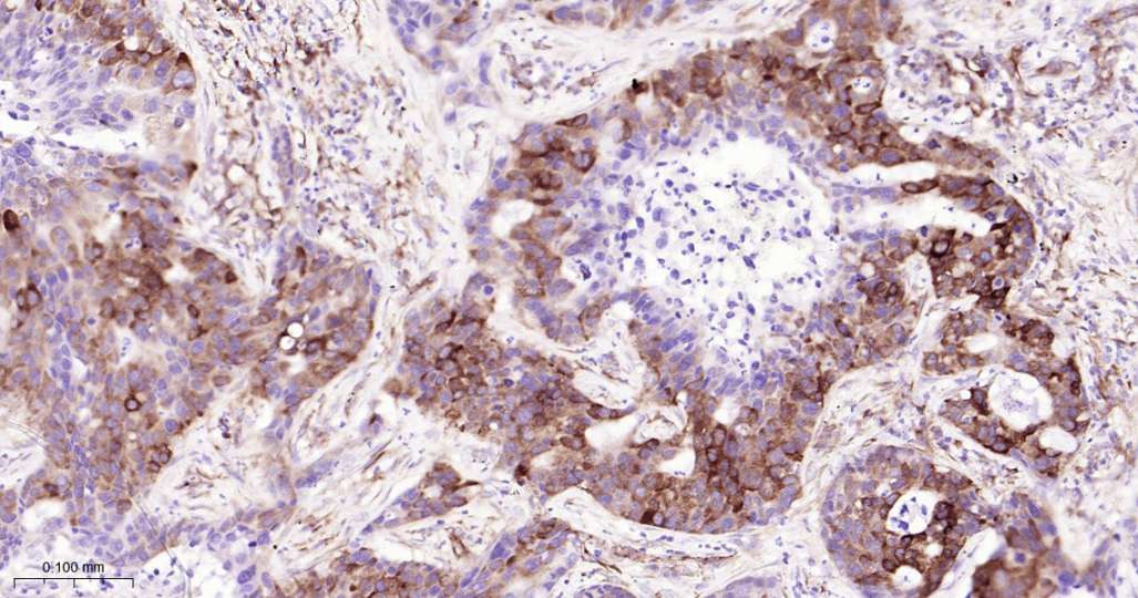 Immunohistochemical analysis of paraffin embedded Human breast cancer tissue slide using IHC0592H (Human Phospho-EIF2S1(Ser51) Kit).