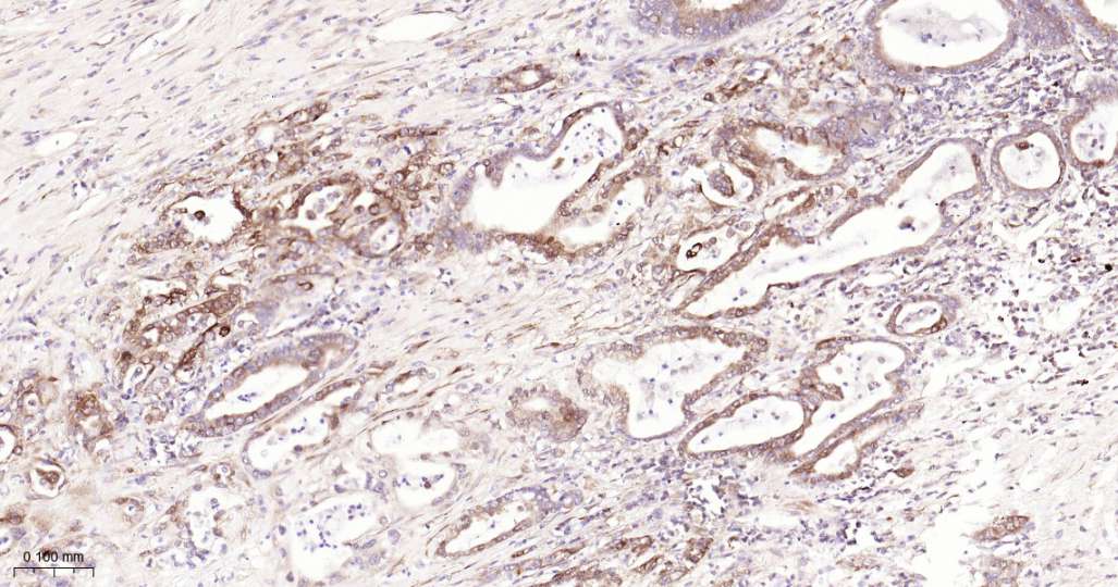 Immunohistochemical analysis of paraffin embedded Human pancreatic cancer tissue slide using IHC0592H (Human Phospho-EIF2S1(Ser51) Kit).