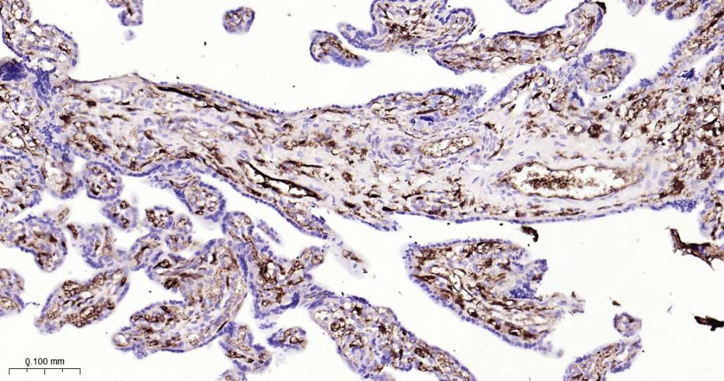 Immunohistochemical analysis of paraffin embedded Human placenta tissue slide using IHC0595H (Human Fibrinogen alpha chain Kit).