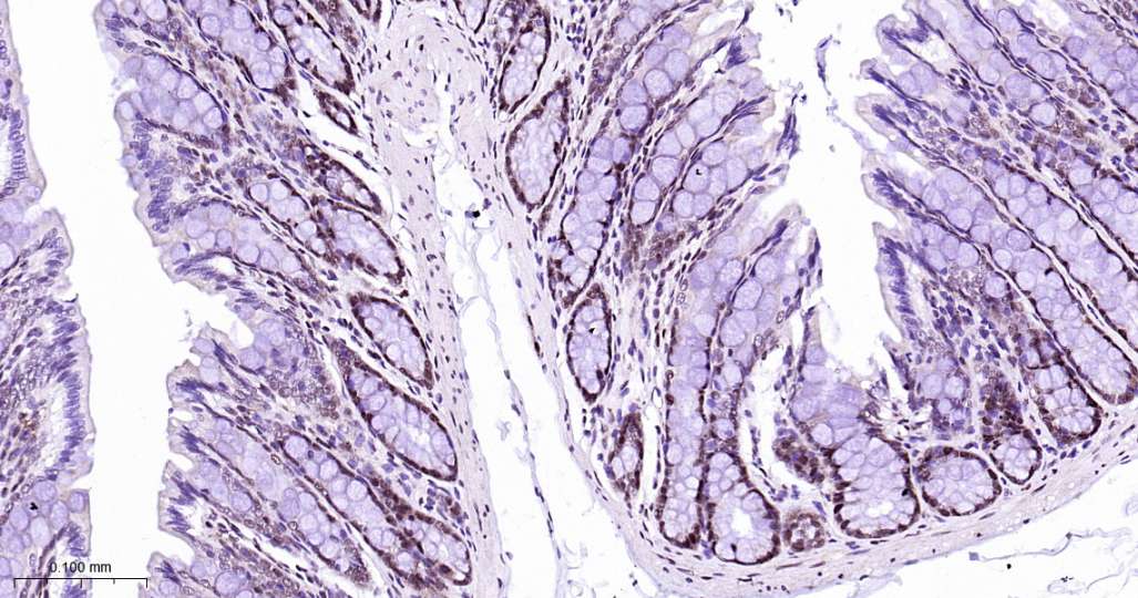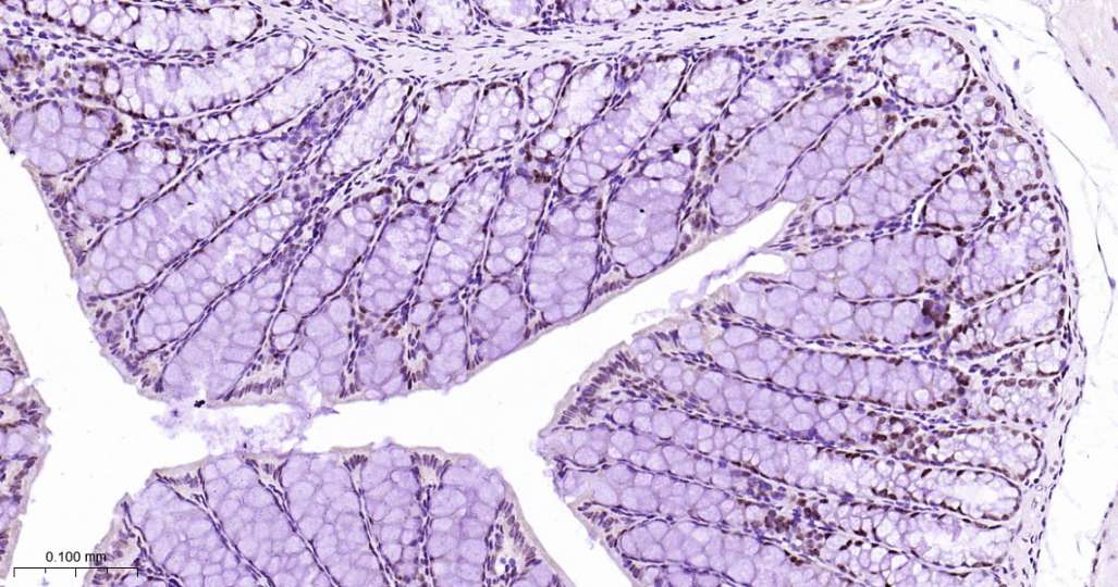 Immunohistochemical analysis of paraffin embedded Mouse colon tissue slide using IHC0601 (HP1 alpha Kit).