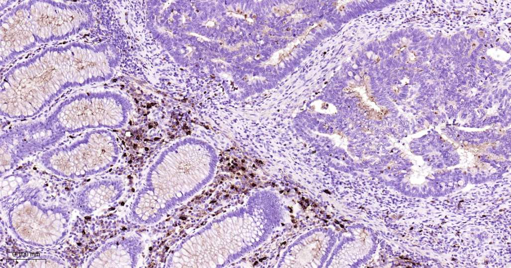 Immunohistochemical analysis of paraffin embedded Human colon cancer tissue slide using IHC0607H (Human CD63 Kit).