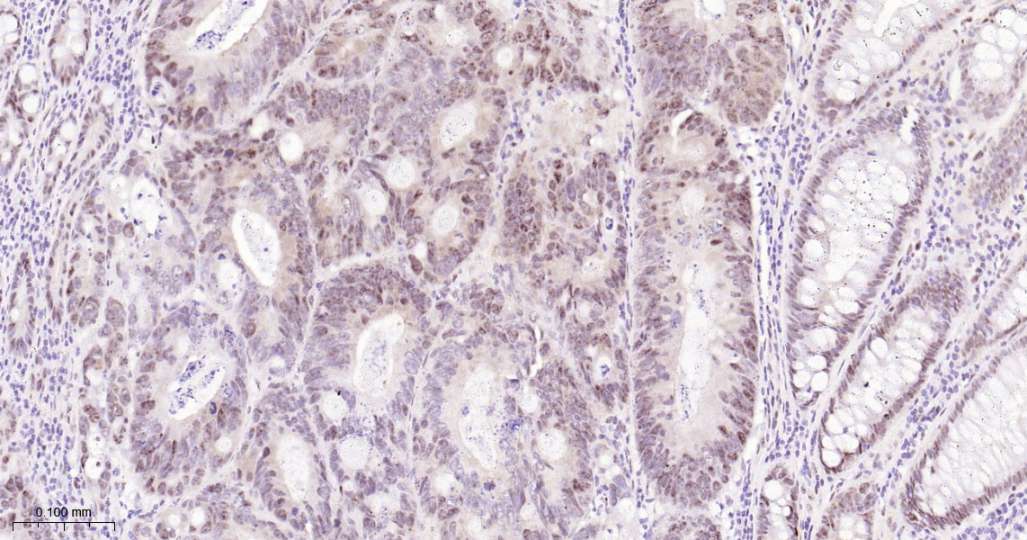 Immunohistochemical analysis of paraffin embedded Human colon cancer tissue slide using IHC0613H (Human FOXP1 Kit).