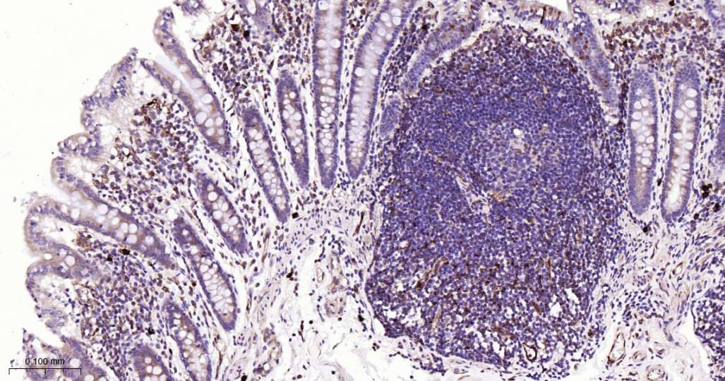 Immunohistochemical analysis of paraffin embedded Human colon tissue slide using IHC0614H (Human STING1 Kit).