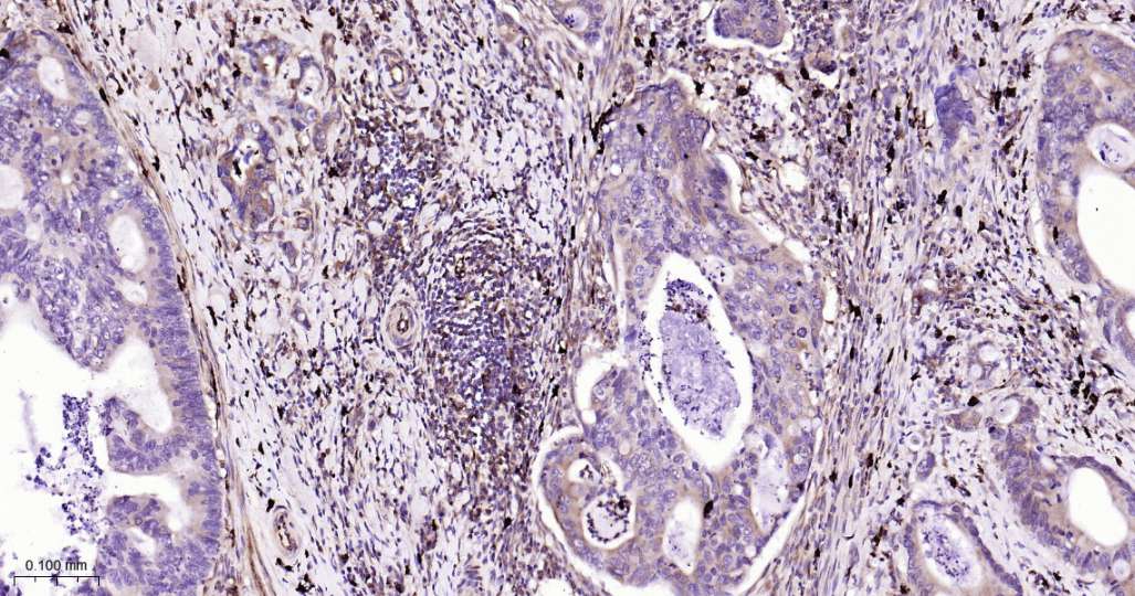 Immunohistochemical analysis of paraffin embedded Human colon cancer tissue slide using IHC0614H (Human STING1 Kit).