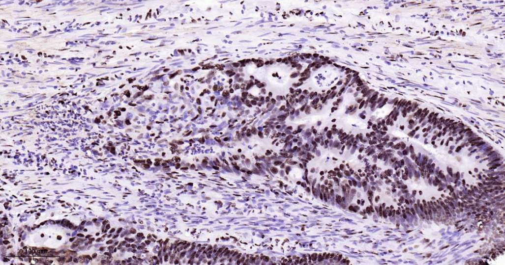 Immunohistochemical analysis of paraffin embedded Human colon cancer tissue slide using IHC0615 (ILF3 Kit).