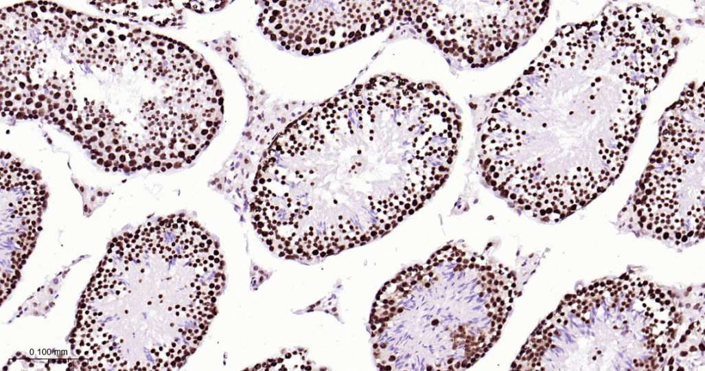 Immunohistochemical analysis of paraffin embedded Mouse testis tissue slide using IHC0615 (ILF3 Kit).