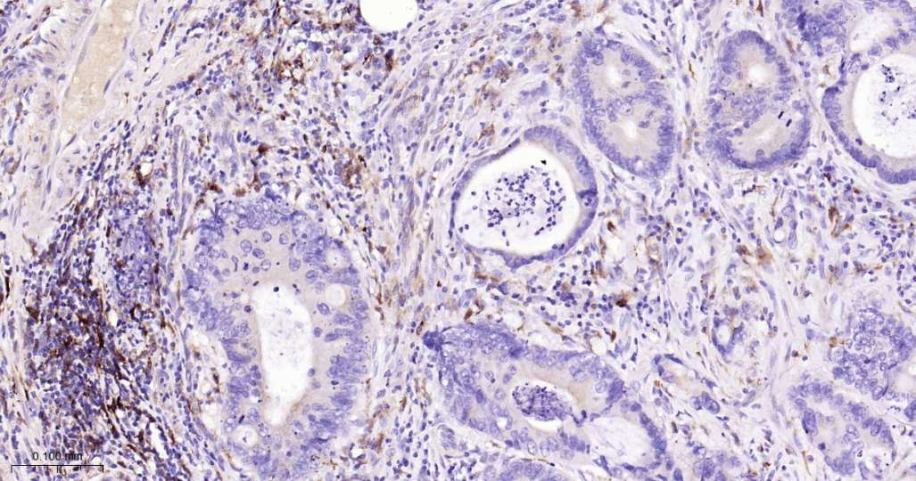 Immunohistochemical analysis of paraffin embedded Human colon cancer tissue slide using IHC0617H (Human HLA-DPB1 Kit).