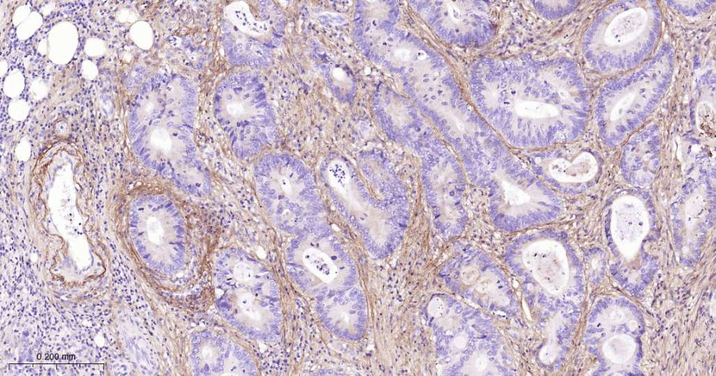Immunohistochemical analysis of paraffin embedded Human colon cancer tissue slide using IHC0618H (Human TGFBI Kit).