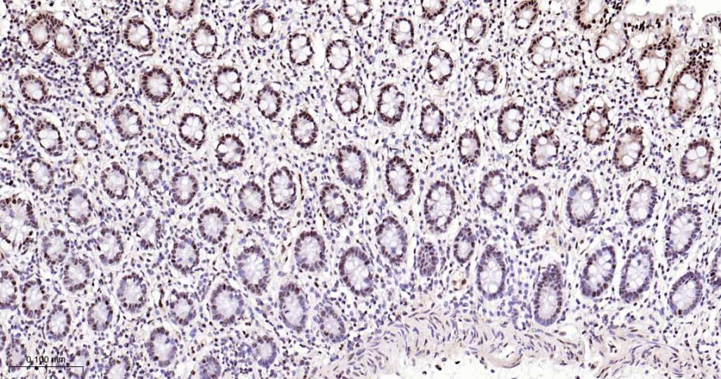 Immunohistochemical analysis of paraffin embedded Human colon tissue slide using IHC0622H (Human phospho-P38 MAPK (T180) Kit).