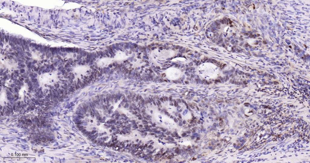Immunohistochemical analysis of paraffin embedded Human colon cancer tissue slide using IHC0622H (Human phospho-P38 MAPK (T180) Kit).