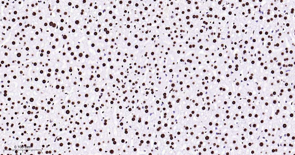 Immunohistochemical analysis of paraffin embedded Mouse liver tissue slide using IHC0623M (Mouse hnRNP U Kit).