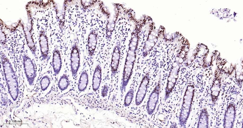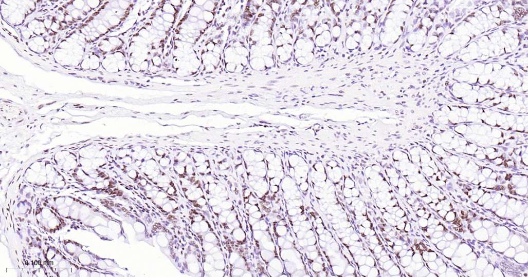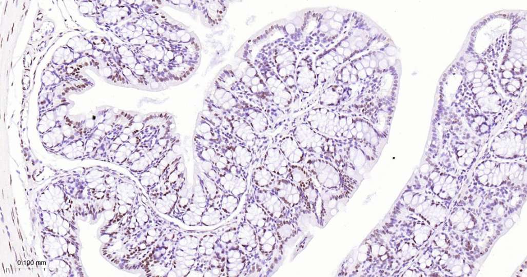 Immunohistochemical analysis of paraffin embedded Mouse colon tissue slide using IHC0626 (Phospho-POLR2A (Ser5) Kit).