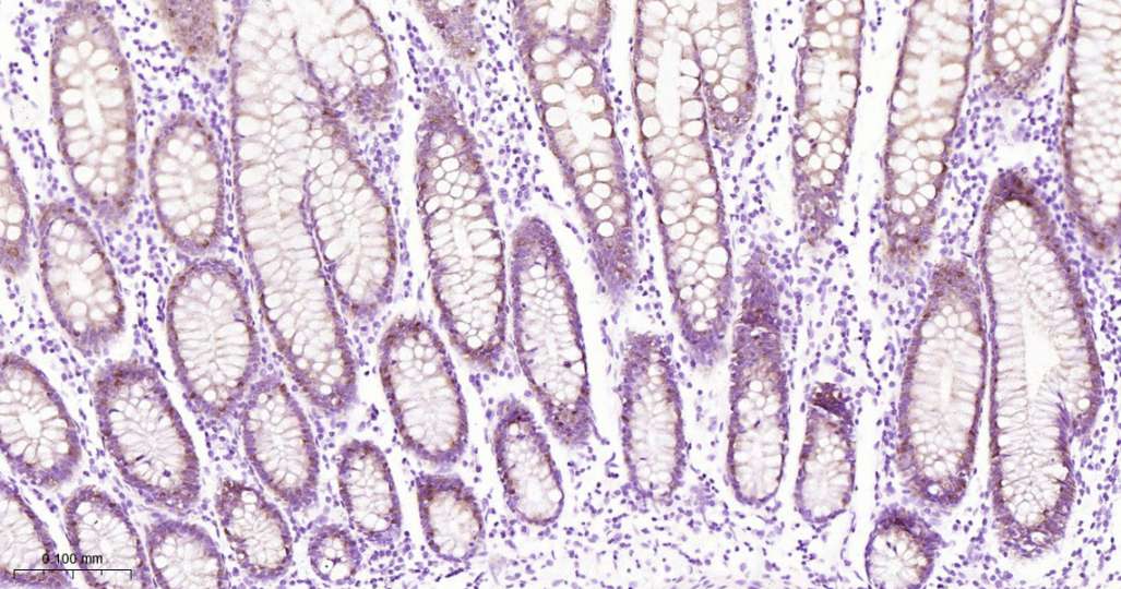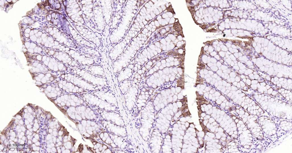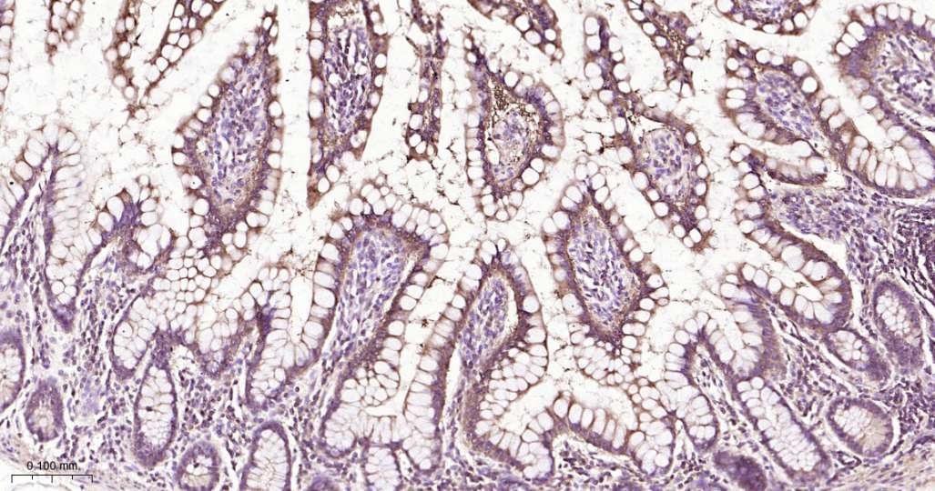 Immunohistochemical analysis of paraffin embedded Mouse colon tissue slide using IHC0632 (IFABP Kit).