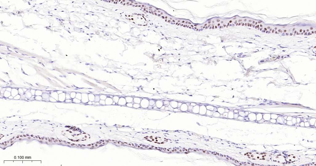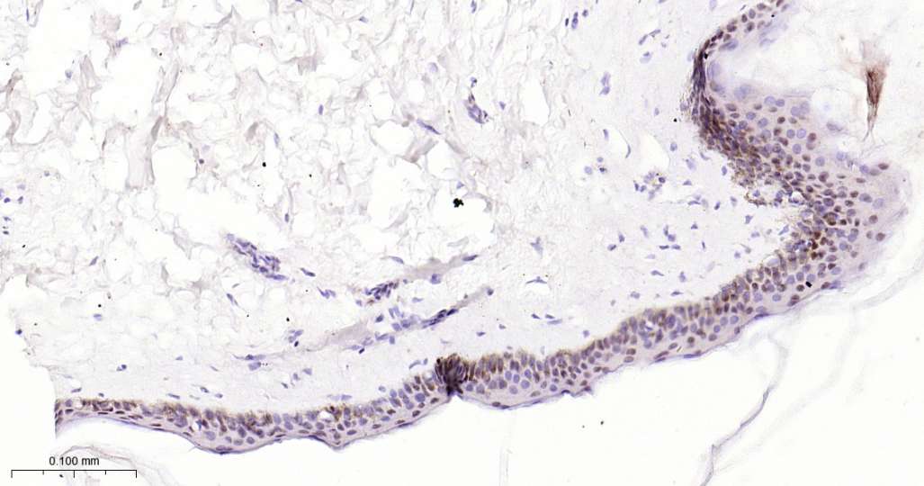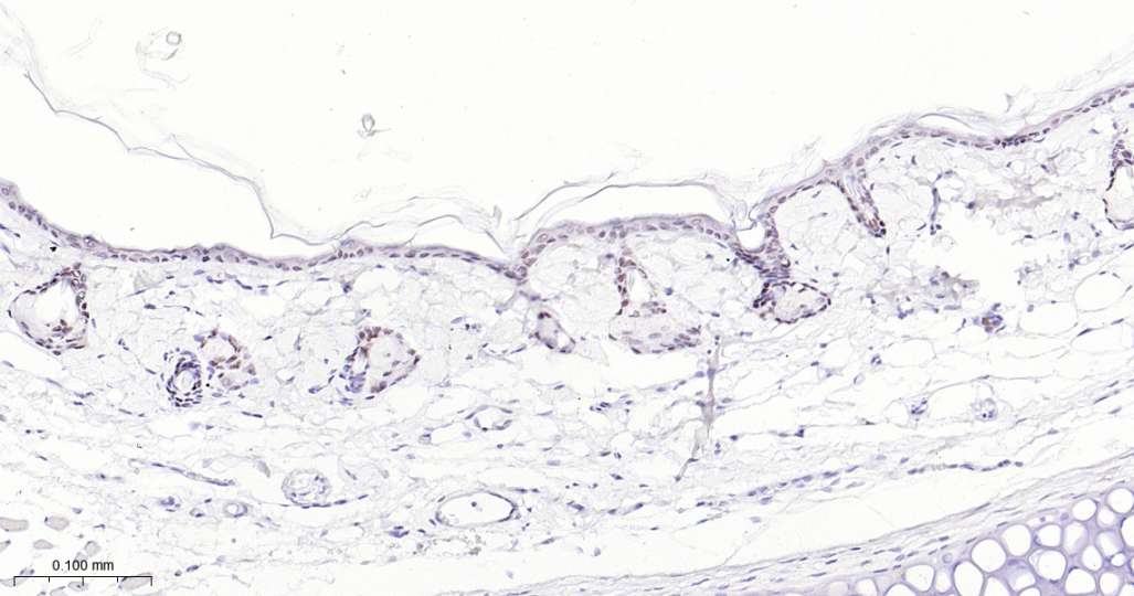 Immunohistochemical analysis of paraffin embedded Mouse skin tissue slide using IHC0637 (AP2 alpha Kit).
