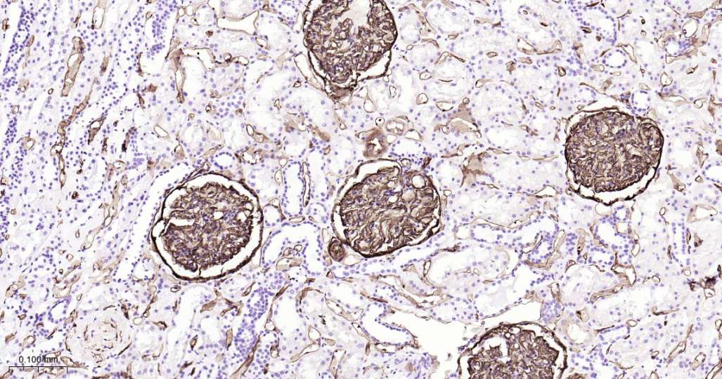 Immunohistochemical analysis of paraffin embedded Human kidney tissue slide using IHC0639H (Human PODXL Kit).
