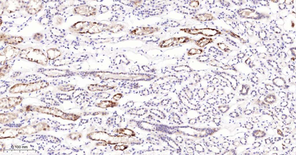 Immunohistochemical analysis of paraffin embedded Human kidney tissue slide using IHC0644H (Human DCP1A Kit).
