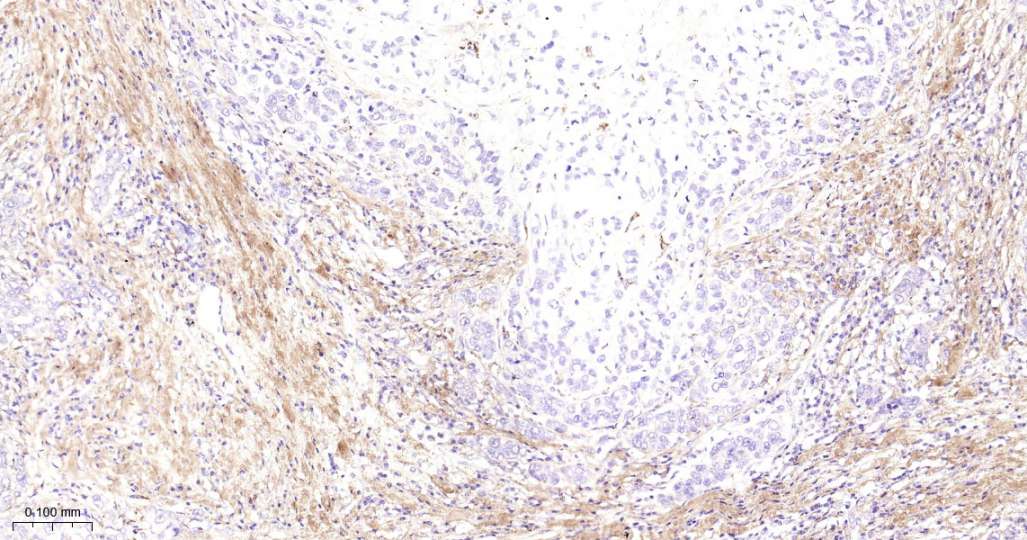 Immunohistochemical analysis of paraffin embedded Human prostatic acinar adenocarcinoma tissue slide using IHC0647H (Human Collagen I Kit).