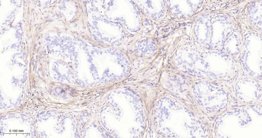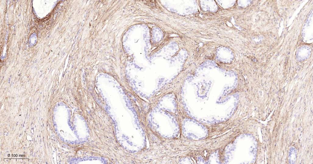 Immunohistochemical analysis of paraffin embedded Human prostate tissue slide using IHC0647H (Human Collagen I Kit).