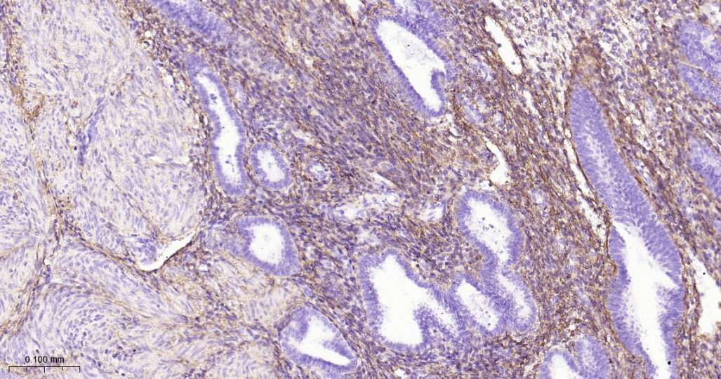Immunohistochemical analysis of paraffin embedded Human uterus tissue slide using IHC0647H (Human Collagen I Kit).