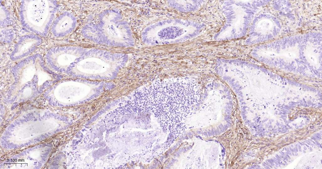 Immunohistochemical analysis of paraffin embedded Human colon cancer tissue slide using IHC0647H (Human Collagen I Kit).