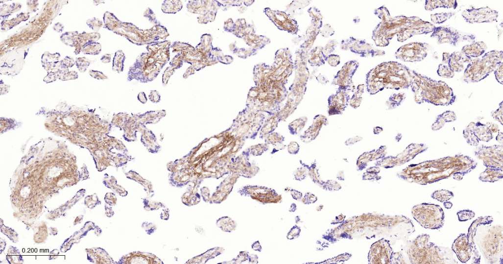 Immunohistochemical analysis of paraffin embedded Human placenta tissue slide using IHC0647H (Human Collagen I Kit).