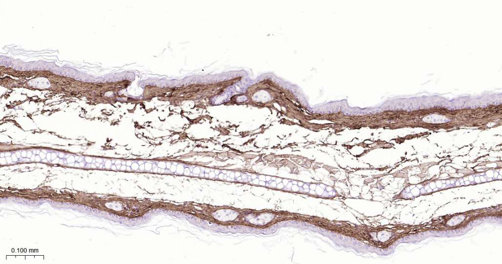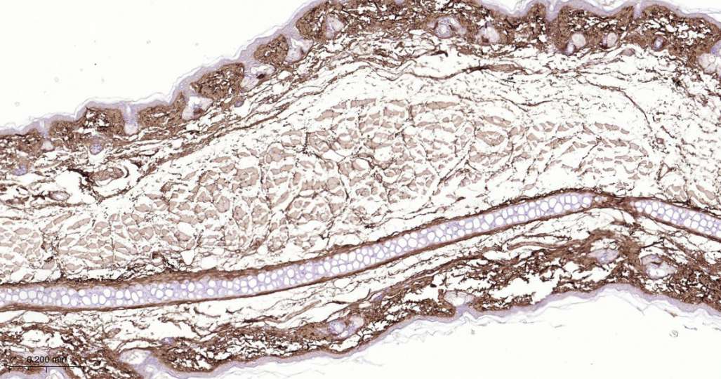 Immunohistochemical analysis of paraffin embedded Mouse skin tissue slide using IHC0648 (Collagen I Kit).