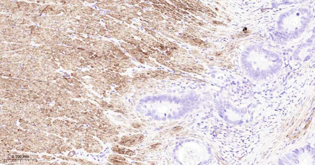 Immunohistochemical analysis of paraffin embedded Human colon cancer tissue slide using IHC0649H (Human MYL9 Kit).