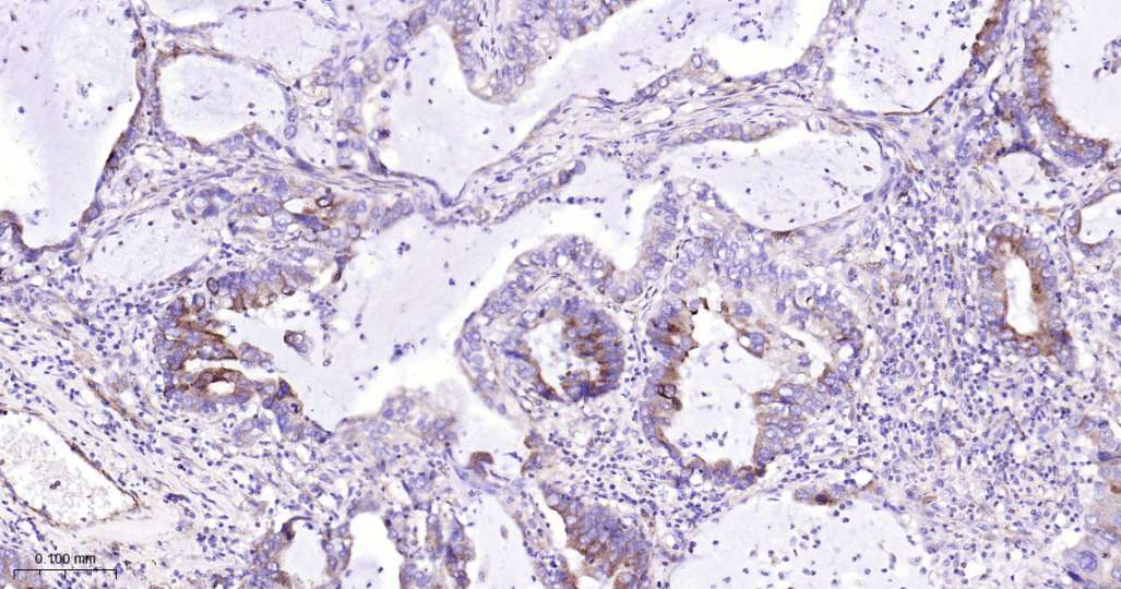 Immunohistochemical analysis of paraffin embedded Human lung cancer tissue slide using IHC0650H (Human MMP1 Kit).