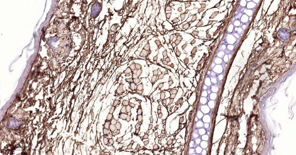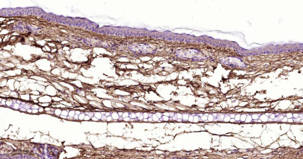Immunohistochemical analysis of paraffin embedded Mouse skin tissue slide using IHC0654 (Collagen III Kit).