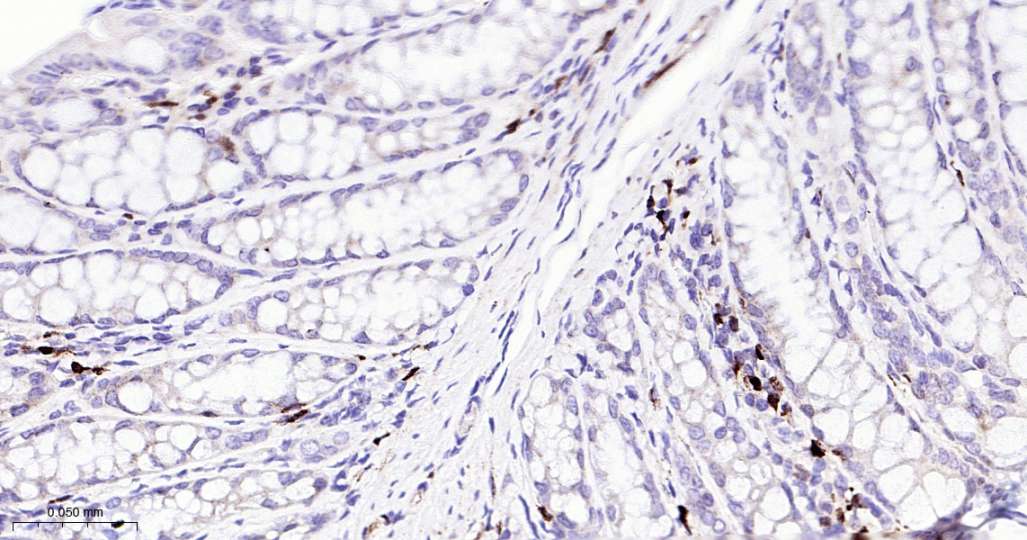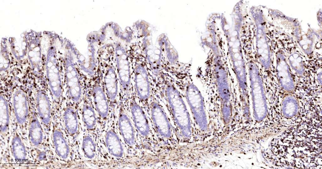Immunohistochemical analysis of paraffin embedded Mouse colon tissue slide using IHC0661 (S100A4 Kit).