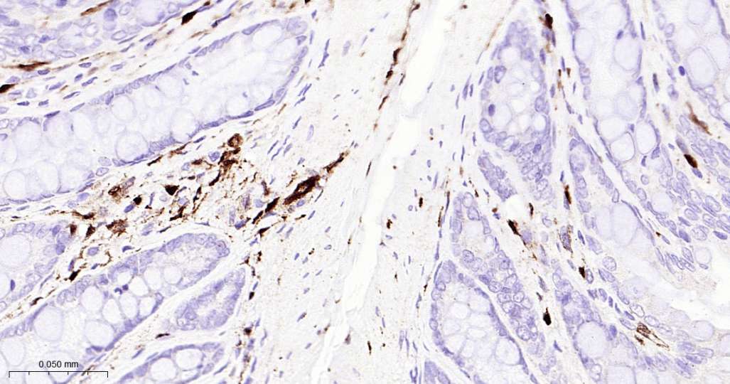 Immunohistochemical analysis of paraffin embedded Human colon tissue slide using IHC0661 (S100A4 Kit).