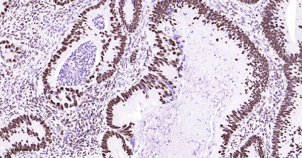 Immunohistochemical analysis of paraffin embedded Human colon cancer tissue slide using IHC0665H (Human Nucleolin Kit).