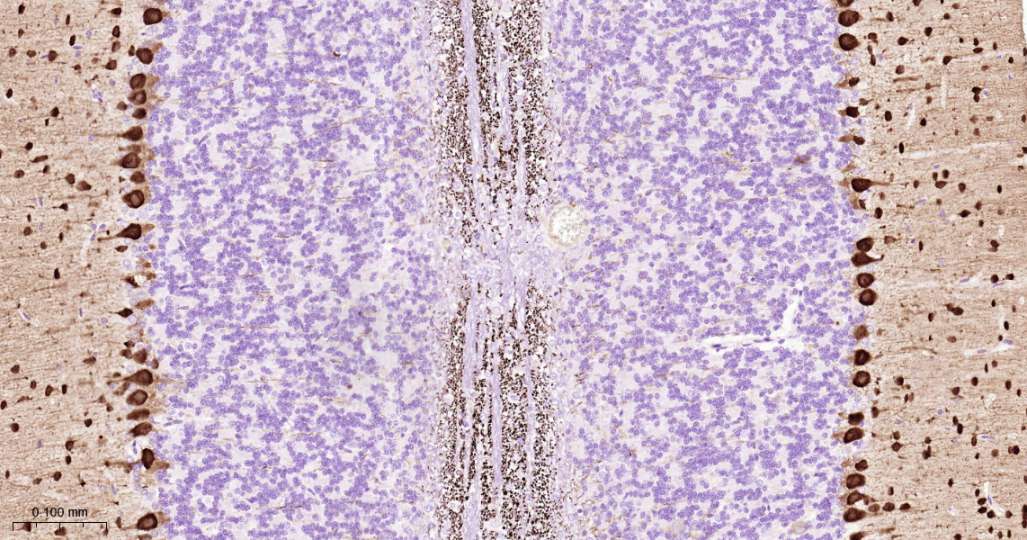 Immunohistochemical analysis of paraffin embedded Mouse cerebellum tissue slide using IHC0672 (Parvalbumin Kit).