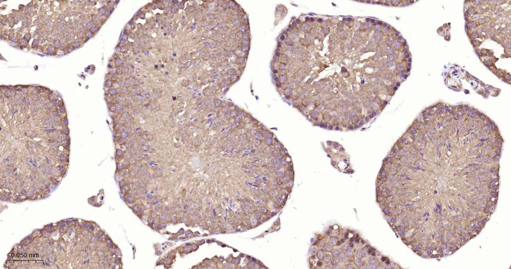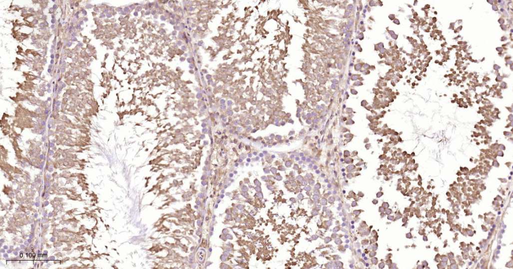 Immunohistochemical analysis of paraffin embedded Mouse testis tissue slide using IHC0674 (14-3-3 alpha/beta/zeta/delta Kit).