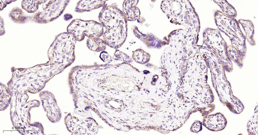 Immunohistochemical analysis of paraffin embedded Human placenta tissue slide using IHC0675H (Human MMP3 Kit).
