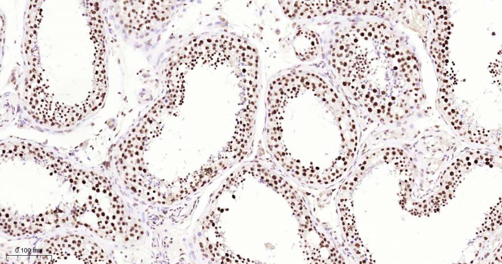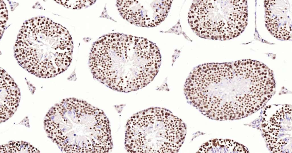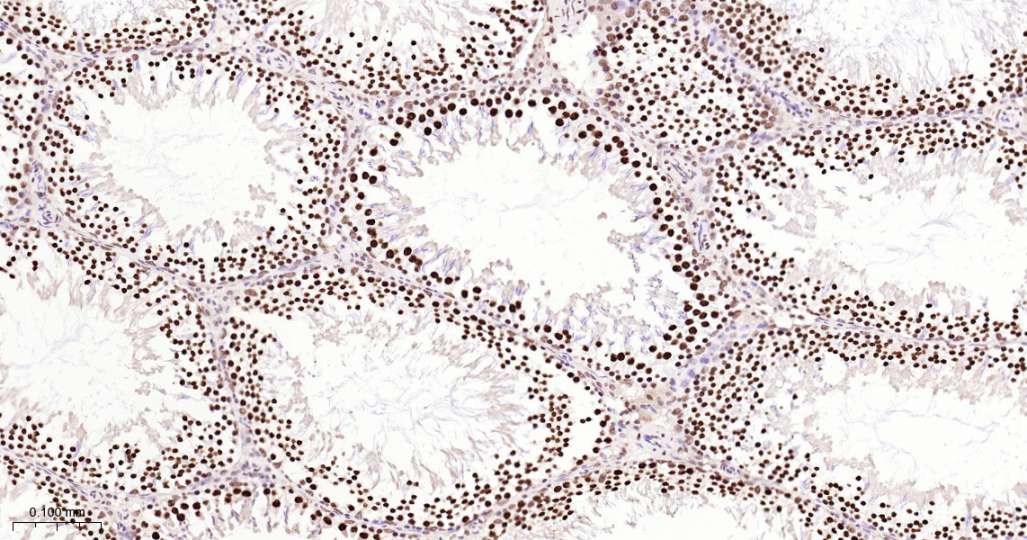 Immunohistochemical analysis of paraffin embedded Mouse testis tissue slide using IHC0677 (MATR3 Kit).