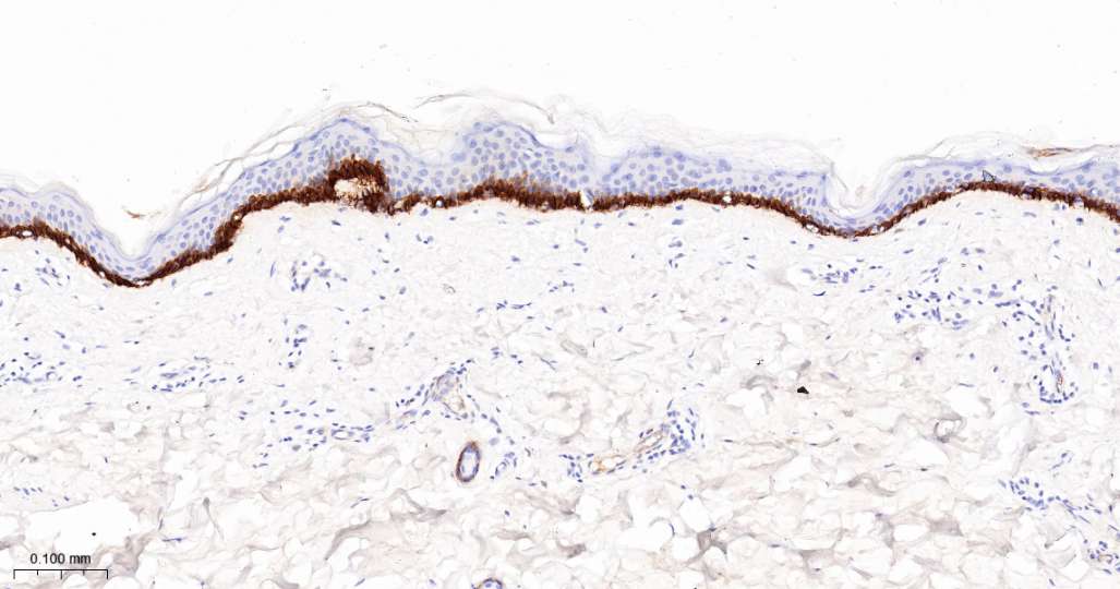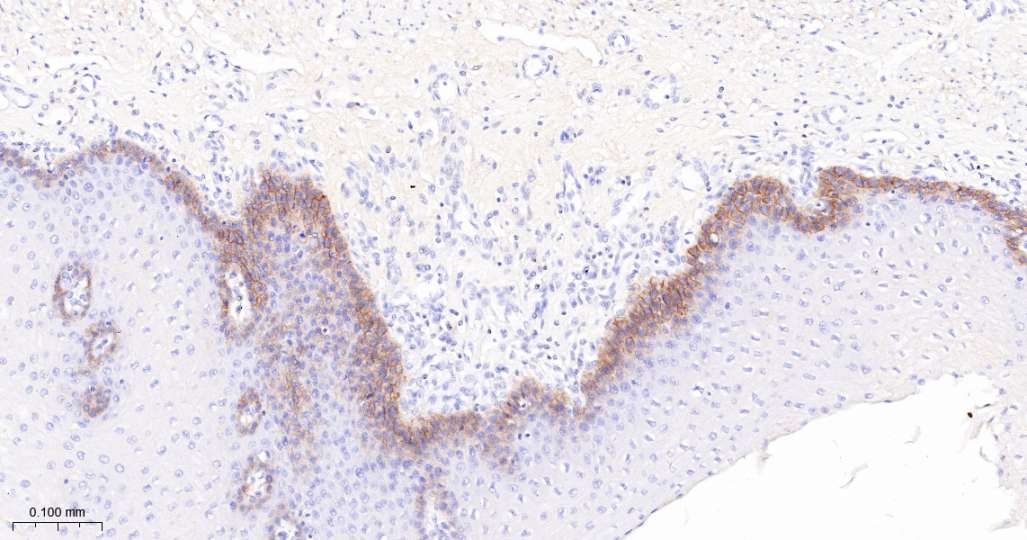Immunohistochemical analysis of paraffin embedded Human esophagus tissue slide using IHC0688H (Human Collagen XVII Kit).