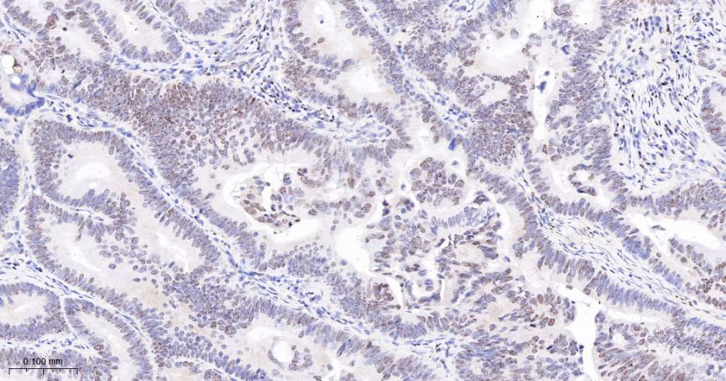 Immunohistochemical analysis of paraffin embedded Human colon cancer tissue slide using IHC0691 (Cleaved PARP1 p85 Kit).